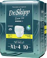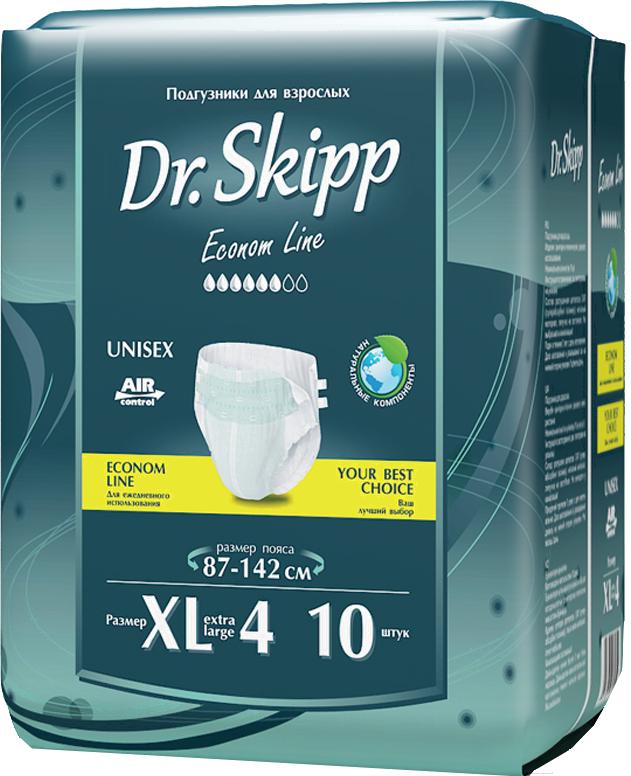 Подгузники для взрослых Dr.Skipp Econom Line XL-4 (10шт); Пол: унисекс; Кол-во в упаковке: 10 шт.; Обхват талии: 87;142 см; Уровень впитываемости: 6 капель; Размер взрослых подгузников: 4 (Extra Large/maxi)