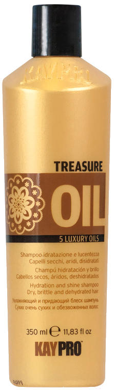 Шампунь для волос Kaypro Treasure Oil 5 Luxury Oils увлажняющий для сухих, хрупких волос (350мл); Действие: очищающее, увлажняющее, придание блеска; Тип волос: сухие, поврежденные, с секущимися кончиками; Пол: для женщин; Активные ингредиенты: комплекс натуральных масел; Объем: 350 мл