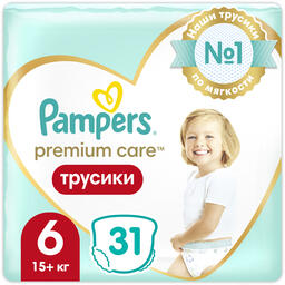 Подгузники-трусики Pampers Premium Care 6 Extra Large (31шт); Пол: унисекс; Назначение: для активного возраста, для приучения к горшку; Вес ребенка: 15; кг; Кол-во в упаковке: 31 шт.; Размер детских подгузников: 6 (Extra Large)