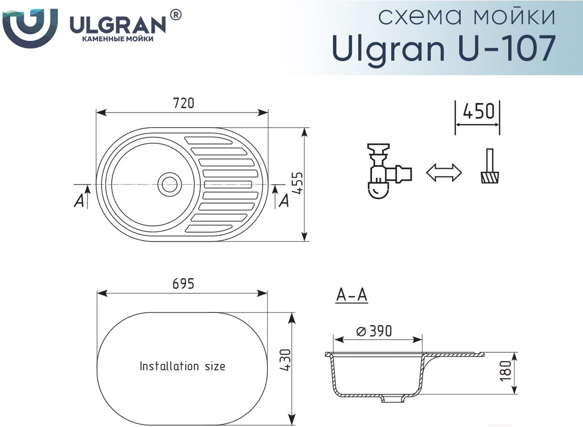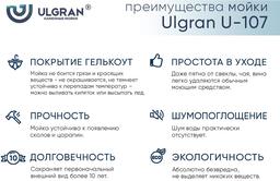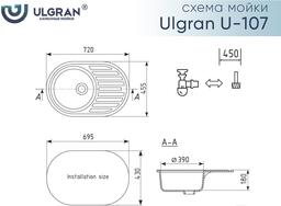 Мойка кухонная Ulgran U-107 (342 графитовый); Способ установки: врезная на столешницу; Длина/диаметр мойки: 72 см; Ширина мойки: 45 см; Материал: искусственный мрамор; Комплект поставки: фреза, сифон