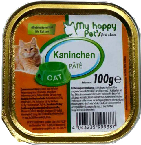Корм для кошек My Happy Pets С кроликом (100г); Тип корма: влажный корм; Виды кошек: взрослые; Назначение: повседневный; Основные ингредиенты: кролик; Общий вес упаковки: 0.1 кг; Класс корма: супер-премиум
