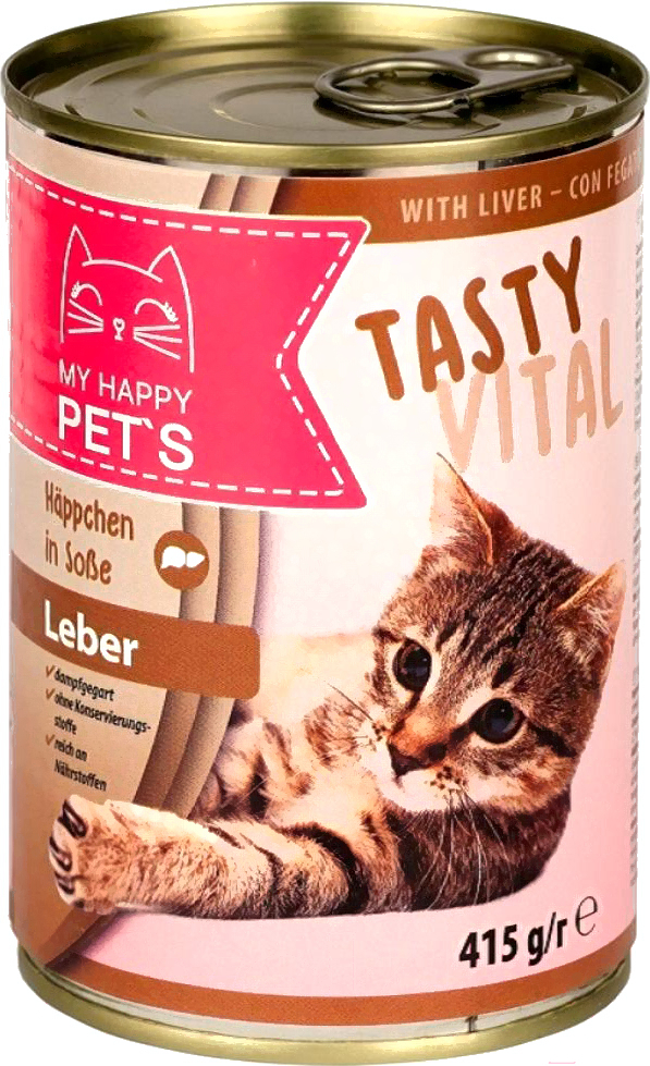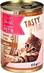 Корм для кошек My Happy Pets С печенью (415г); Тип корма: влажный корм; Виды кошек: взрослые; Назначение: повседневный; Основные ингредиенты: злаки, индейка; Общий вес упаковки: 0.415 кг; Класс корма: супер-премиум