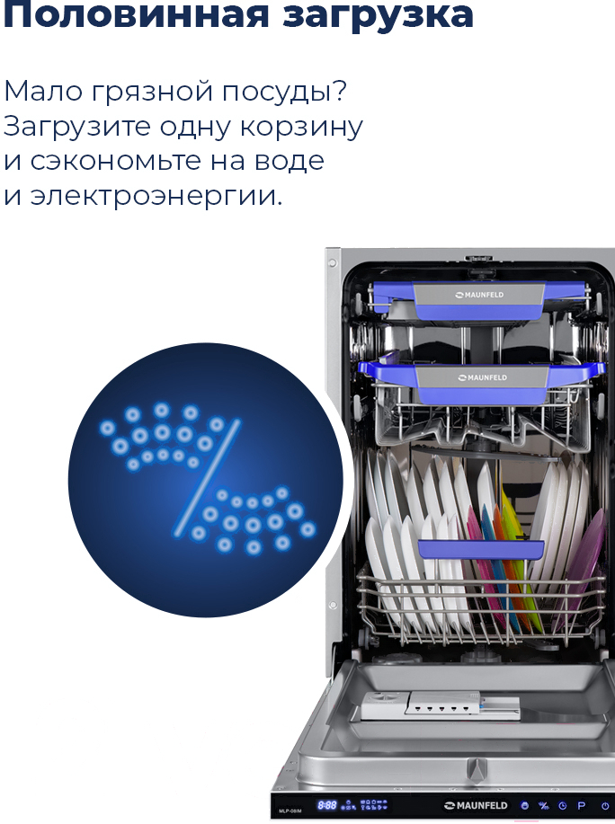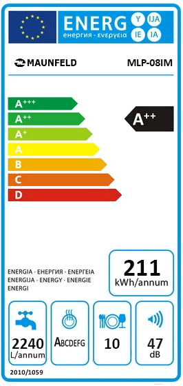 Посудомоечная машина Maunfeld MLP 08IM; Установка: встраиваемая; Максимальная загрузка: 10 компл.; Класс энергопотребления: А++; Управление: электронное; Количество программ: 8; Высота встраивания: 82 см; Ширина встраивания: 45 см; Глубина встраивания: 58 см; Формат: узкая; Тип встраивания: полностью