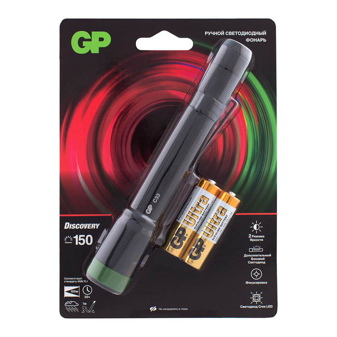 Фонарь GP C33BE ручной алюминиевый корпус 150 Лм с фокусировкой, магнит, дополнительная боковая