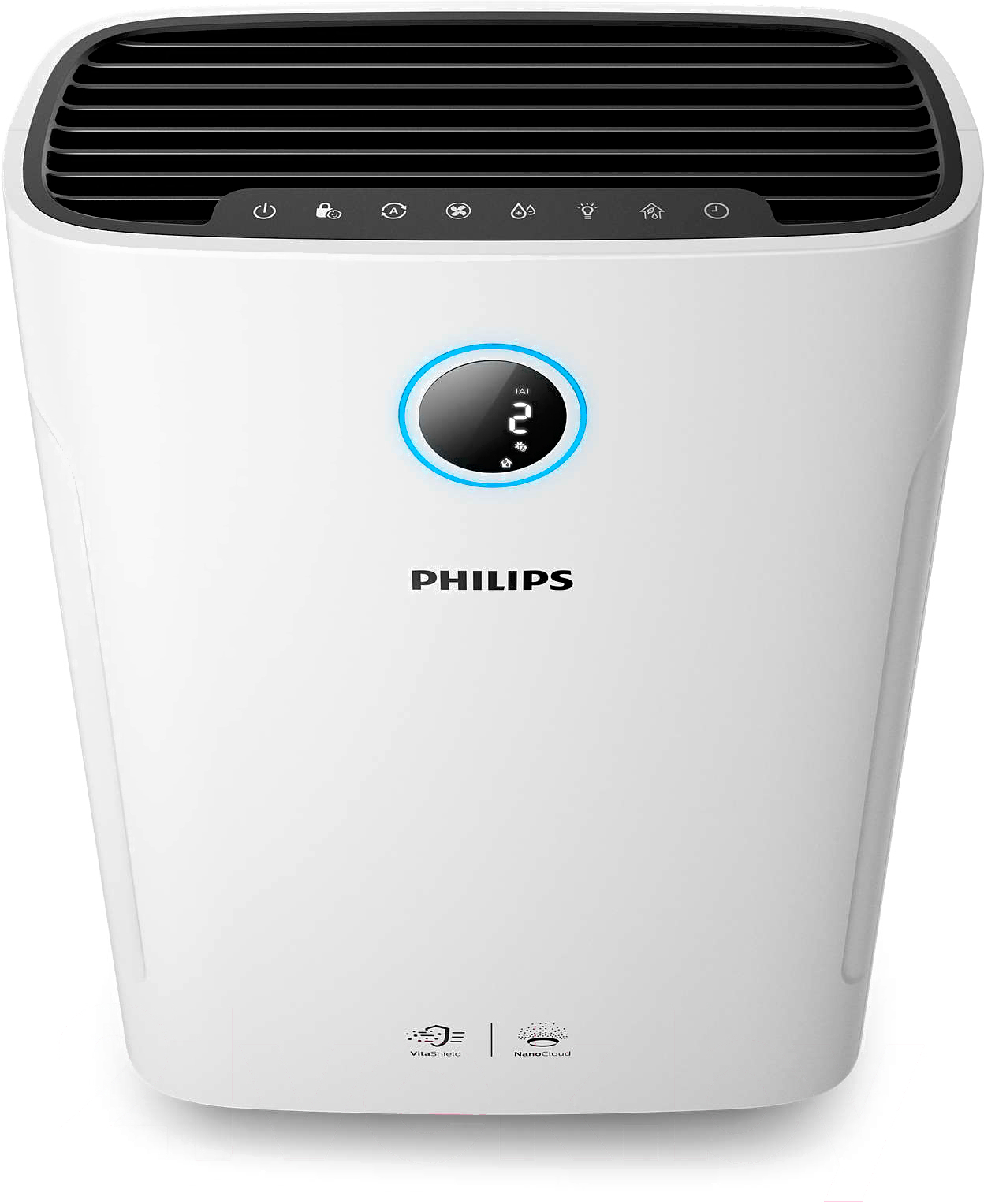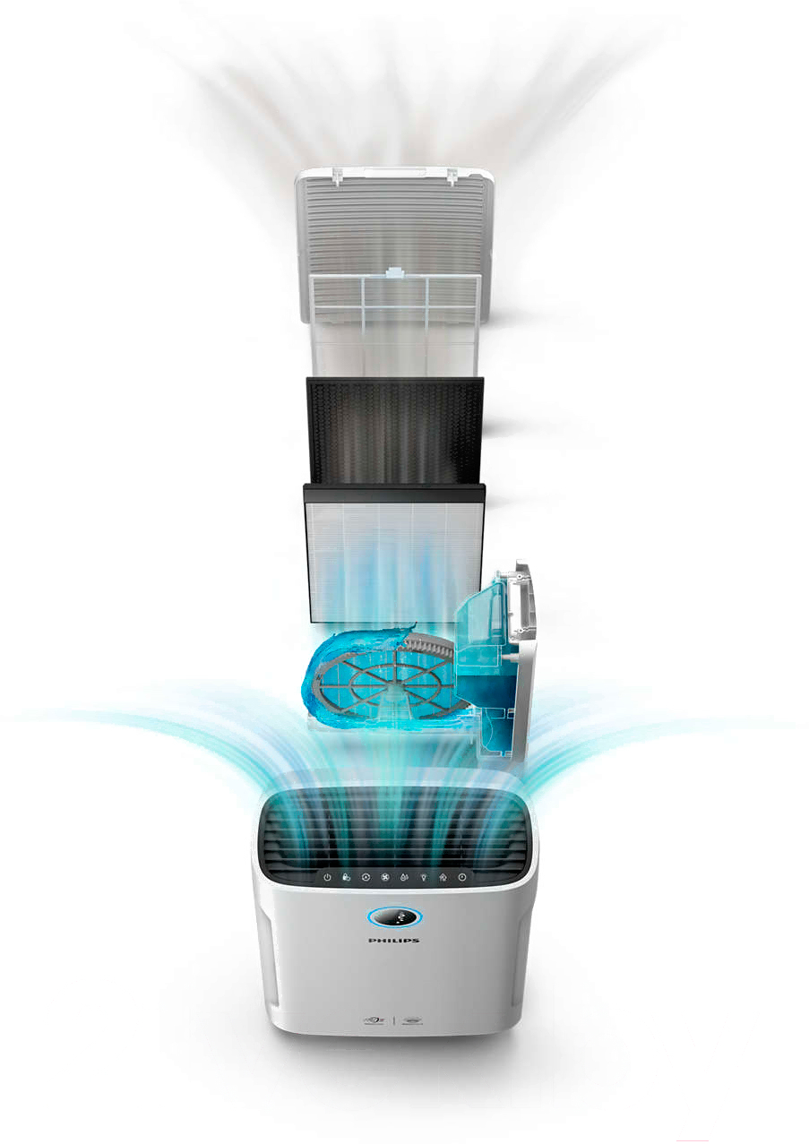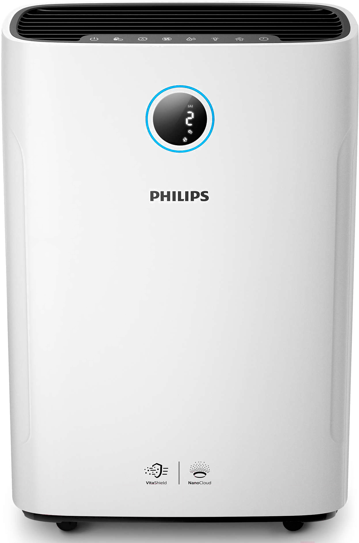 Климатический комплекс Philips AC2721/10; Тип: климатический комплекс; Размещение: настольный; Индикация: режима, низкого уровня воды, замены/очистки деталей, качества воздуха; Воздухообмен: 250 м³/ч; Макс. обслуживаемая площадь: 65 м²
