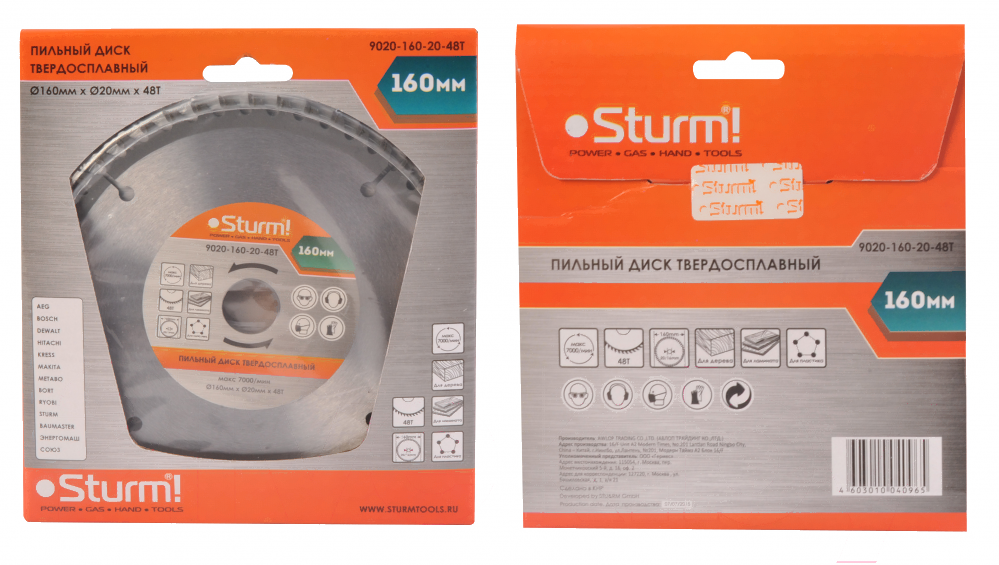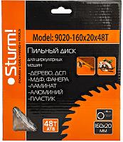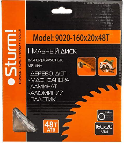 Пильный диск Sturm! 9020-160-20-48T; Обрабатываемый материал: дерево, пластик, ламинат, алюминий; Максимальные обороты (пильного), об/мин: 7000; Диаметр диска, мм: 160; Посадочный диаметр, мм: 20