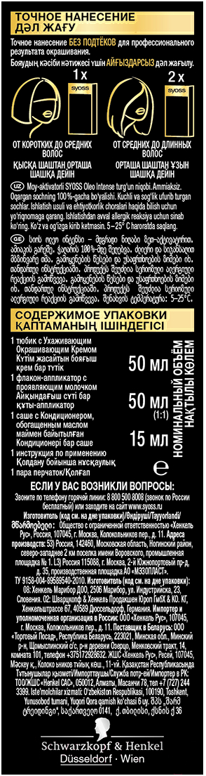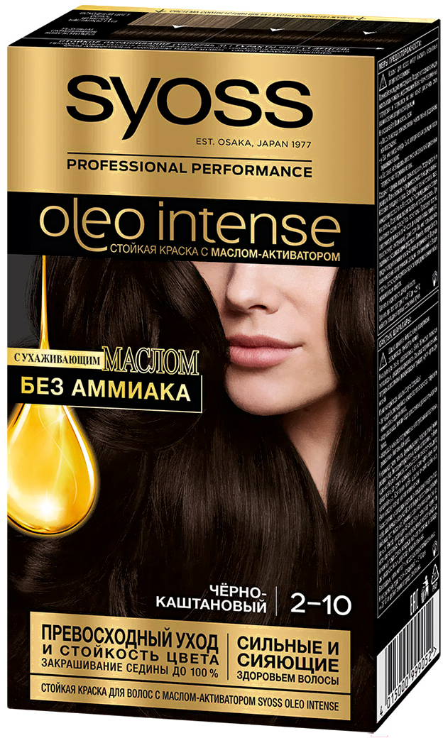 Крем-краска для волос Syoss Oleo Intense стойкая 2-10 (черный/каштановый); Цвет: брюнет, шатен; Оттенок: 2-10 Черно-каштановый; Объем: 115 мл; Степень окрашивания: перманент; Закрашивание седины: есть; Применение: бытовое