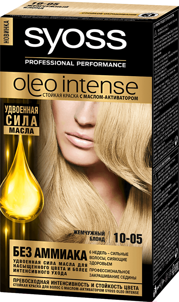 Крем-краска для волос Syoss Oleo Intense стойкая 10-05 (жемчужный блондин); Цвет: блонд; Оттенок: 10-05 Жемчужный блондин; Объем: 115 мл; Степень окрашивания: перманент; Закрашивание седины: есть; Применение: бытовое