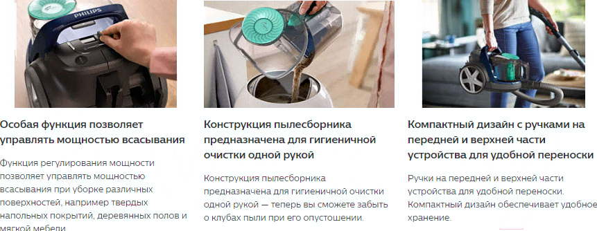 Пылесос Philips FC9569/01; Конструкция: пылесос; Возможности уборки: сухая; Тип пылесборника: контейнер; Объём пылесборника: 1.5 л; Мощность всасывания: 400 Вт; Труба всасывания: телескопическая; Регулировка мощности: есть