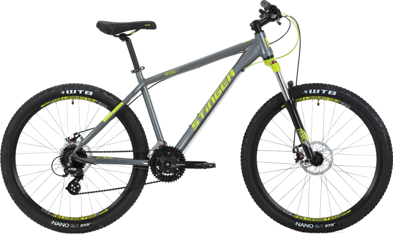 Велосипед Stinger Reload Std 27AHD.RELOADSTD.16GR8; Класс: горный (MTB); Назначение: универсальный; Материал рамы: алюминиевый сплав; Тип переднего тормоза: дисковый механический; Тип заднего тормоза: дисковый механический; Диаметр колес: 27.5"; Размер рамы: 16"; Рост: 150;165 см