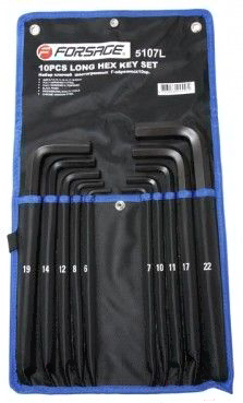 Набор ключей Forsage F-5107L; Количество предметов в наборе: 10 шт; Вид ключа: имбусовый; Вид профиля: шестигранный; Размер(ы) ключа (мм): 14, 17, 19, 22, 10, 11, 12, 8, 6, 7