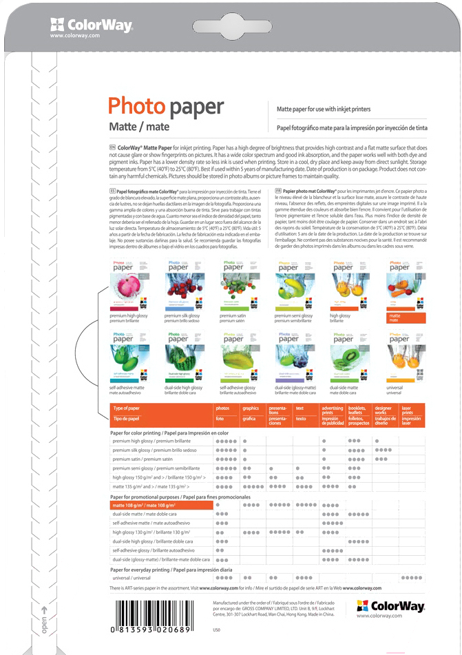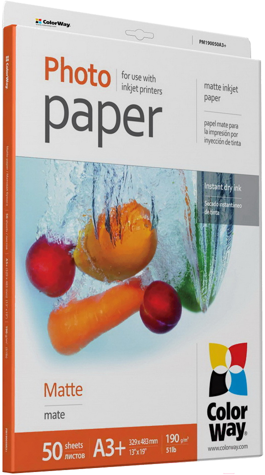 Фотобумага ColorWay PM190050A3+; Назначение: для струйной печати; Плотность: 190 г/кв.м; Цвет: белый; Поверхность: матовая; Количество листов: 50 шт.