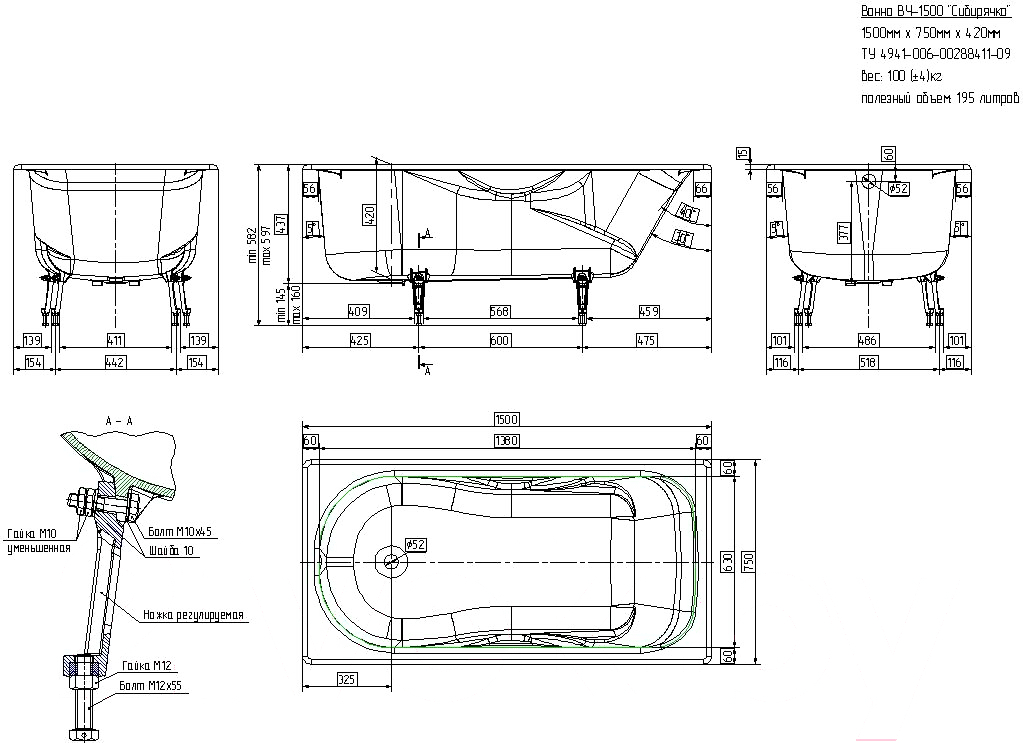 Ванна чугунная Универсал Сибирячка-У 150x75 (1 сорт, с ручками и ножками); Размещение: встраиваемая; Гидромассаж: нет; Ножки в комплекте: есть