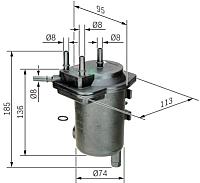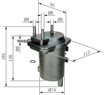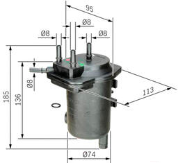 Топливный фильтр Bosch 0450907008; Исполнение фильтра: прямоточный (циркуляционный); Диаметр корпуса: 95 мм; Высота: 185 мм