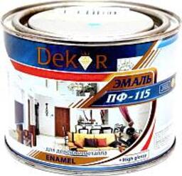 Эмаль Dekor ПФ-115 (6кг, белый глянцевый); Назначение: для окон и дверей, для металлических изделий, для деревянных изделий; Тип работ: внутренние, наружные; Вид окрашиваемого материала: металл, дерево, штукатурка, ДВП, ДСП; Цвет: белый; Степень глянца: глянцевая; Свойства: атмосферостойкая, быстросохнущая, износостойкая, водостойкая; Название оттенка: белый
