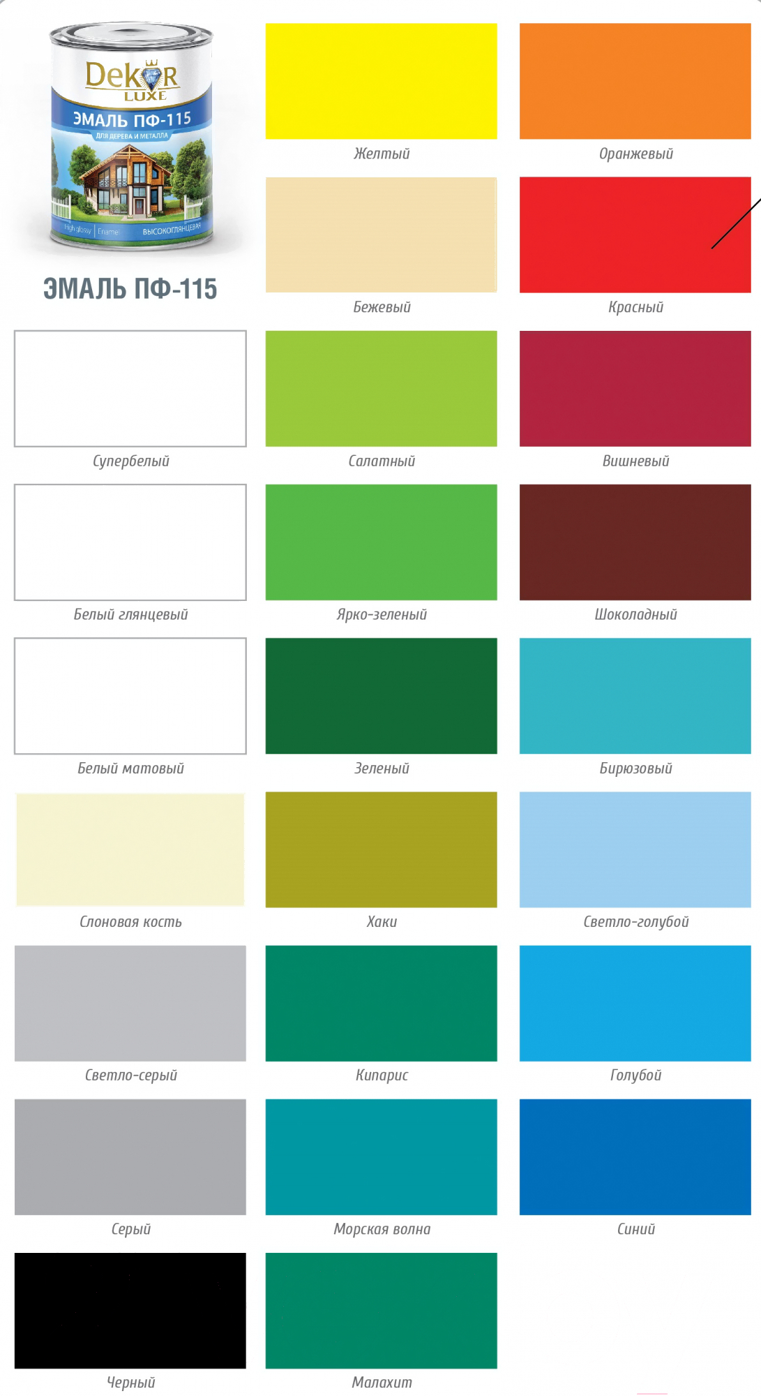 Эмаль Dekor ПФ-115 (20кг, белый глянцевый); Назначение: для окон и дверей, для металлических изделий, для деревянных изделий; Тип работ: внутренние, наружные; Вид окрашиваемого материала: металл, дерево, штукатурка, ДВП, ДСП; Цвет: белый; Степень глянца: глянцевая; Свойства: атмосферостойкая, быстросохнущая, износостойкая, водостойкая; Название оттенка: белый