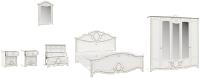 Комплект мебели для спальни Империал Барбара без ОМ ШК-5 (белый/золото); Состав комплекта: шкаф, двуспальная кровать, комод, тумба, зеркало интерьерное; Материал фасада: МДФ, зеркало; Материал каркаса: МДФ, металл; Зеркало: на дверце шкафа, интерьерное; Ширина спального места: 160 см; Длина спального места: 200 см