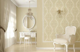 Обои Vimala Лорен 2941; Тип обоев: виниловые; Основа: флизелиновая; Текстура: тиснение/рельеф; Цвет: желтый, рисунок; Ширина: 1.06 м; Длина: 10 м