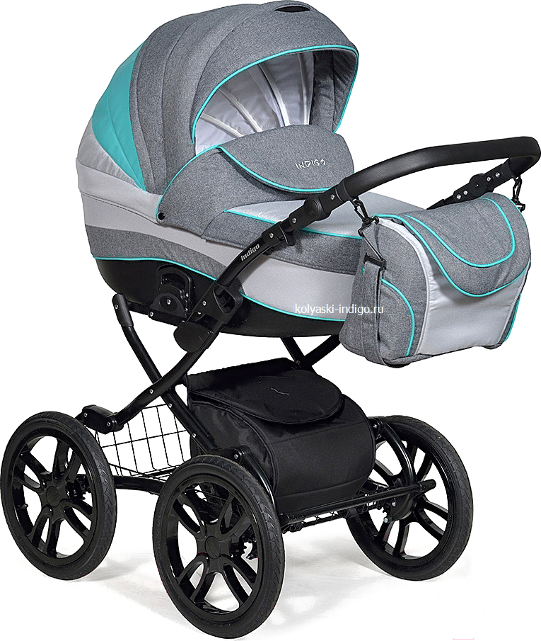 Детская универсальная коляска INDIGO 18 Spesial Plus 14" (Sp 05, темно-серый/светло-серый/бирюзовая кожа); Тип коляски: детская универсальная коляска; Механизм складывания: книжка; Конструкция: модульная 2-в-1 (люлька/прогулочная); Материал рамы: алюминий; Шины: резиновые; Смена положения ребенка: есть, смена положения модуля; Дополнительные элементы: сумка, москитная сетка, дождевик, чехол для ног; Вес: 14.5 кг