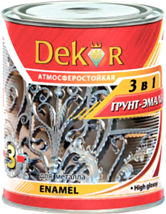 Эмаль Dekor 3 в 1 алкидная (1.9кг, черный); Назначение: на ржавчину, для металлических изделий, для деревянных изделий; Тип работ: внутренние, наружные; Вид окрашиваемого материала: металл, дерево; Цвет: черный; Степень глянца: глянцевая; Свойства: атмосферостойкая, быстросохнущая, водостойкая, грязеотталкивающая