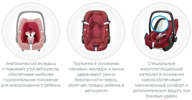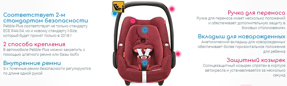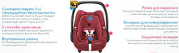 Автокресло Maxi-Cosi Pebble Plus (rework red); Группа: 0+; Крепление кресла: Isofix, штатный ремень автомобиля; Ремни для ребенка: внутренние трехточечные; Установка на базу: есть; Установка на шасси: есть; Возможности регулировки: высота внутренних ремней, высота подголовника, натяжение ремней, положение ручки для переноса; Дополнительные элементы: ручка для переноса, анатомический вкладыш