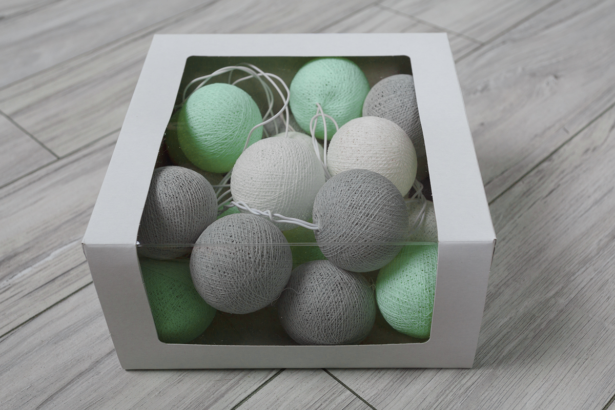 - Комплектация 20 хлопковых шариков; светодиодная гарлянда 3 метра, 20 светодиодов; 3 батарейки АА; коробка для хранения.