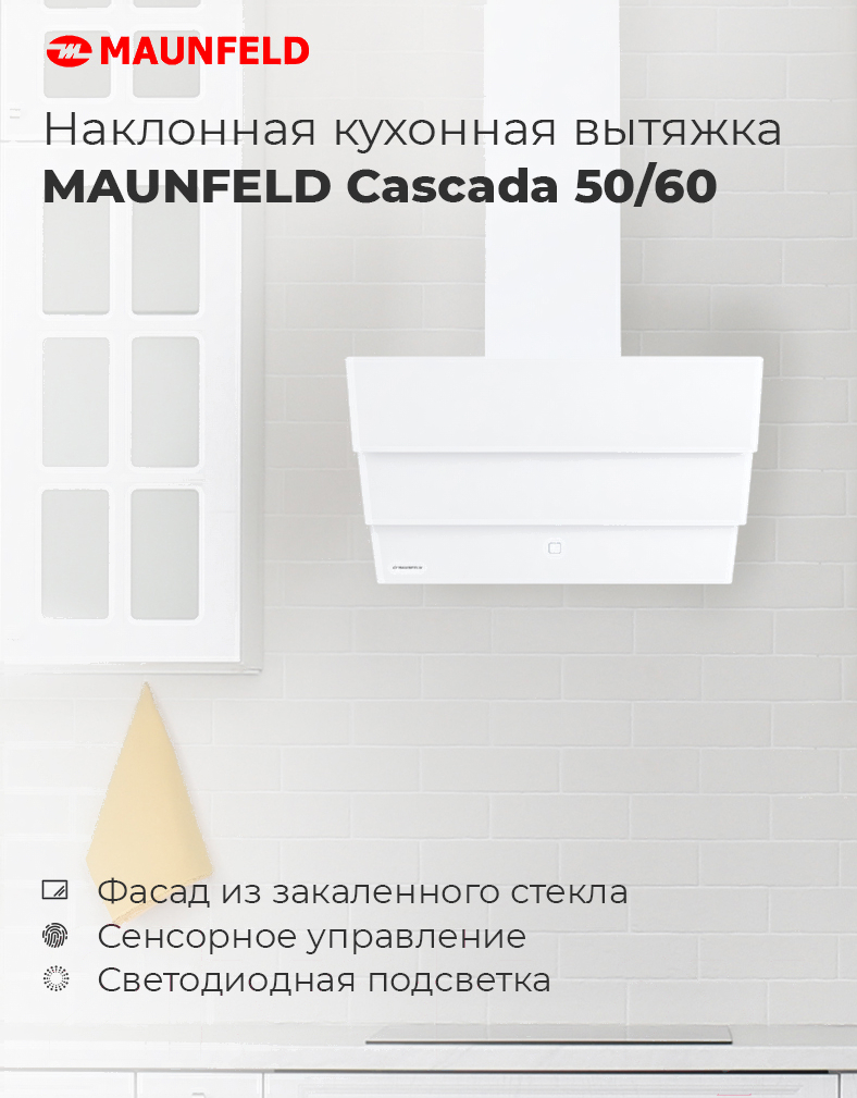 Вытяжка декоративная Maunfeld Cascada 60 (белый); Режим работы: отвод/циркуляция; Тип освещения: светодиодное; Ширина: 60 см; Материал корпуса: сталь, стекло; Управление: электронное; Конструкция: вытяжка декоративная; Монтаж: настенный