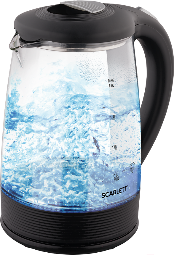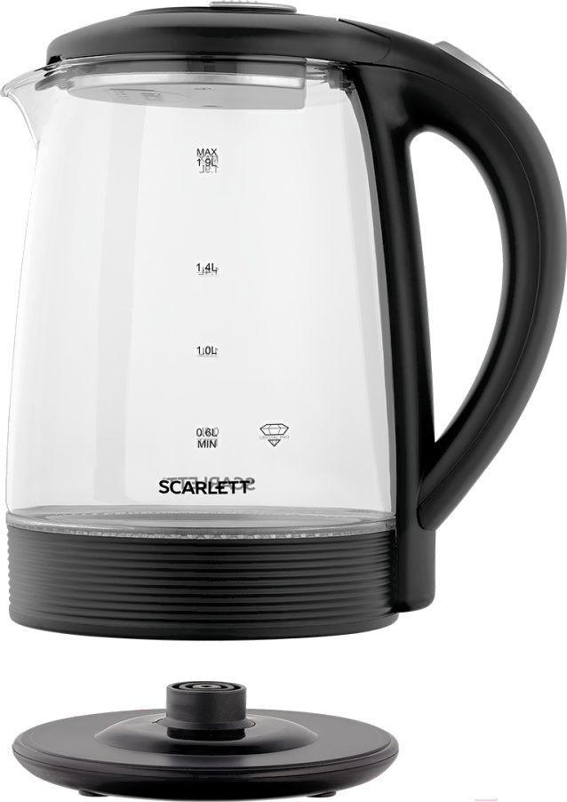 Электрочайник Scarlett SC-EK27G68; Нагревательный элемент: закрытая спираль; Мощность: 1500 Вт; Объем: 1.9 л; Подставка: с возможностью вращения; Материал корпуса: стекло