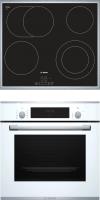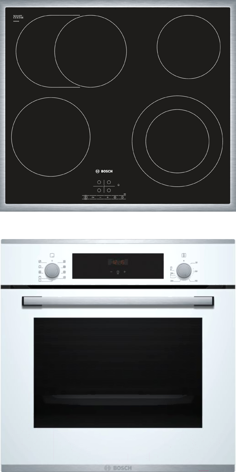 Комплект встраиваемой техники Bosch HBF234EW0R + PKN645B17; Тип панели: электрическая; Общая мощность: 8000 Вт; Наличие специальных зон нагрева: двухконтурные, овальной формы; Тип шкафа: электрический; Объём: 66 л; Очистка: каталитическая; Количество режимов нагрева: 8; Режимы нагрева: нижний нагрев, нижний + верхний нагрев, размораживание, режим для пиццы, быстрый разогрев, 3D горячий воздух, термогриль, Vario-гриль, горячий воздух gentle