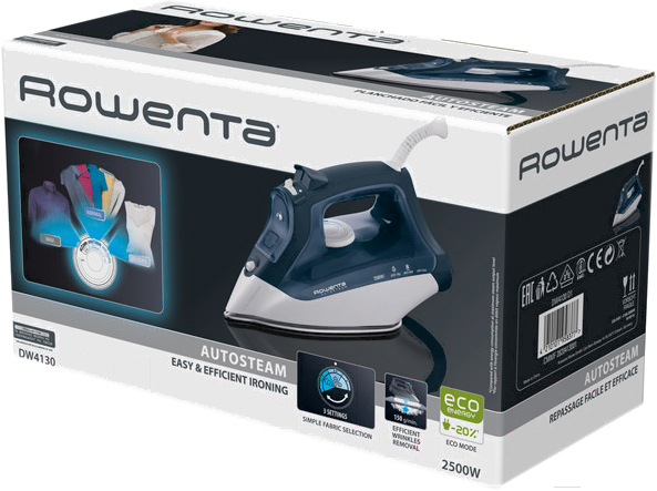 Утюг Rowenta DW4130D1; Тип: утюг; Материал подошвы: нержавеющая сталь ; Мощность: 2500 Вт; Объём резервуара для воды: 250 мл; Скорость подачи пара: 40 г/мин; Скорость парового удара: 150 г/мин