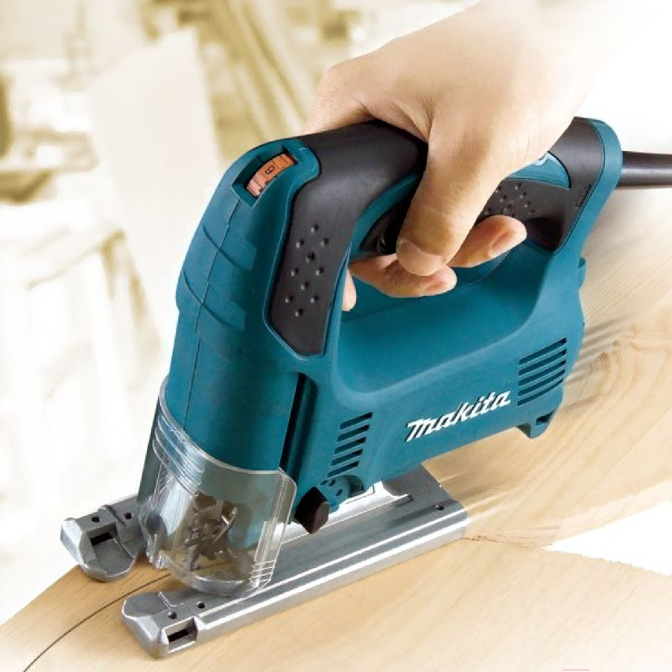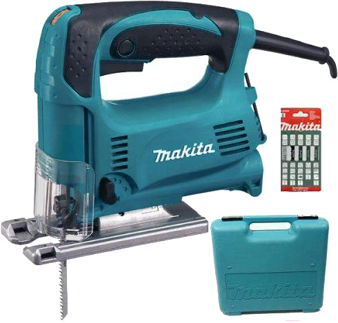 Профессиональный электролобзик Makita 4329KX1; Макс. глубина пропила стали: 6 мм; Макс. глубина пропила дерева: 65 мм; Кол-во ходов в минуту: 3100; Потребляемая мощность: 450 Вт; Дополнительные функции: наклон платформы; Маятниковый ход: есть, 3 режима