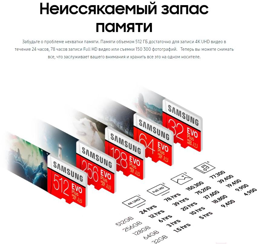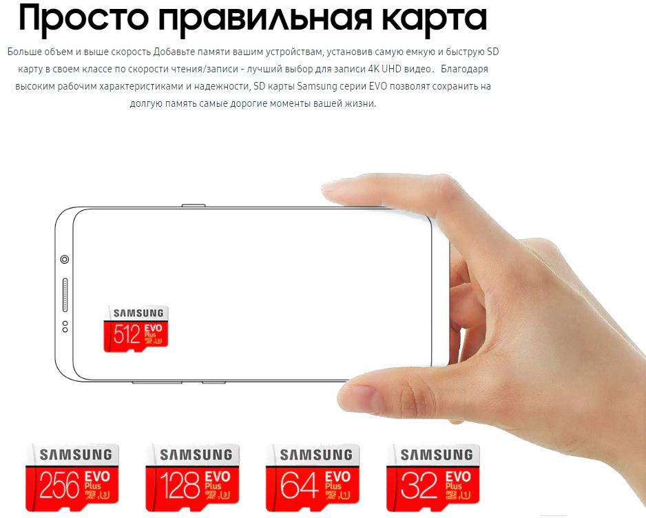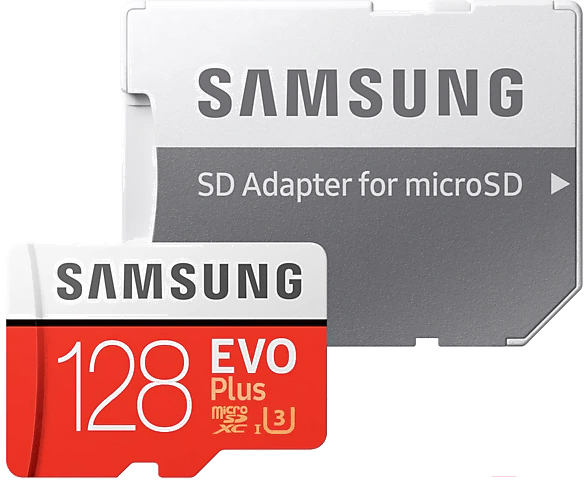 Карта памяти Samsung Evo Plus microSD 128GB (MB-MC128HA/RU); Тип: microSDXC; Объем: 128 Гб; Класс скорости: 10; Максимальная скорость чтения: 100 Мб/с; Максимальная скорость записи: 60 Мб/с