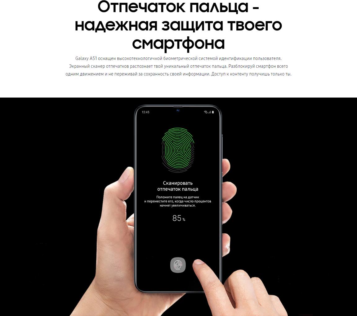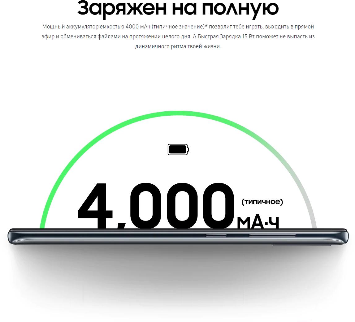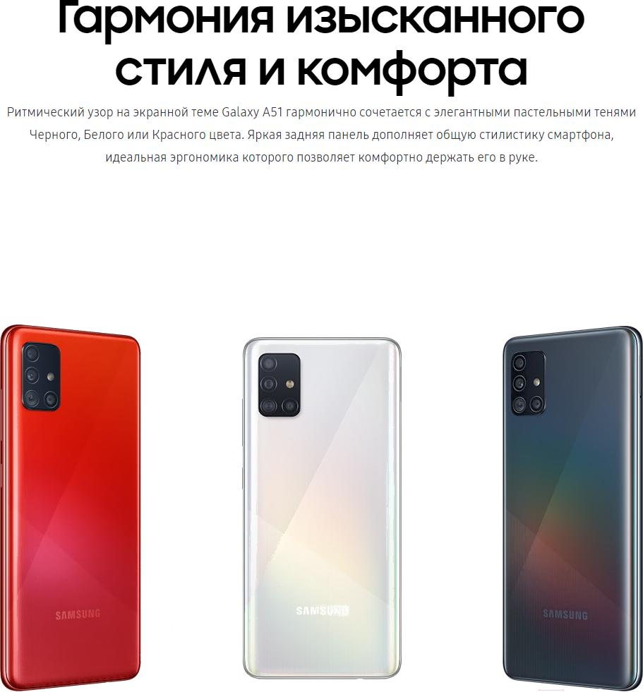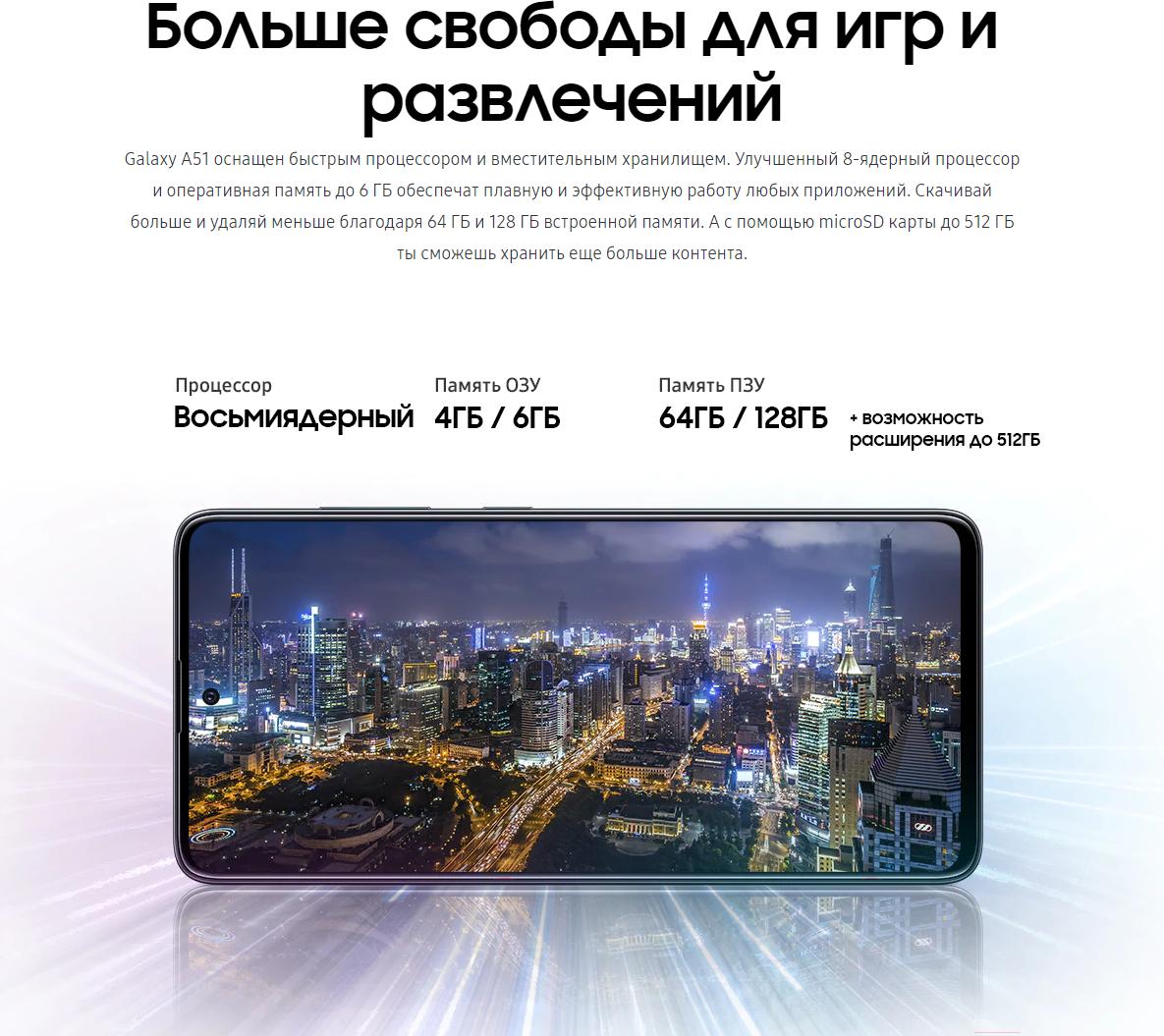 Смартфон Samsung Galaxy A51 64GB / SM-A515FZBMSER (синий); Тактовая частота процессора: 2300 МГц; Версия операционной системы: Android 10.0; Диагональ экрана: 6.5 "; Емкость аккумулятора: 4000 мАч; Кол-во SIM-карт: 2; Разрешение экрана: 2400×1080; Оперативная память: 4 Гб; Постоянная память: 64 Гб; Разрешение камеры: 48 Мп
