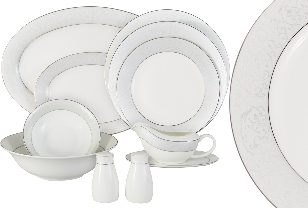 - Состав набора: обеденная тарелка 25,5 см - 6 шт; суповая тарелка 20 см - 6 шт; закусочная тарелка 21 см - 6 шт, салатник 23 см - 1 шт; салатник 16,5 см - 2 шт; блюдо 36,5 см - шт; блюдо 23,5 см - 1 шт; соусник - 1 шт; блюдо под соусник - 1 шт; солонка - 1 шт; перечница