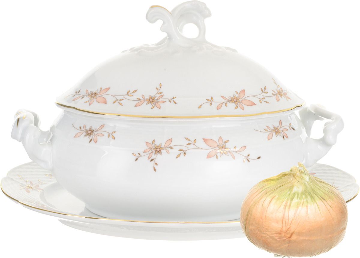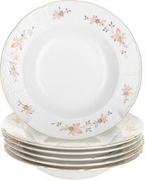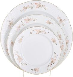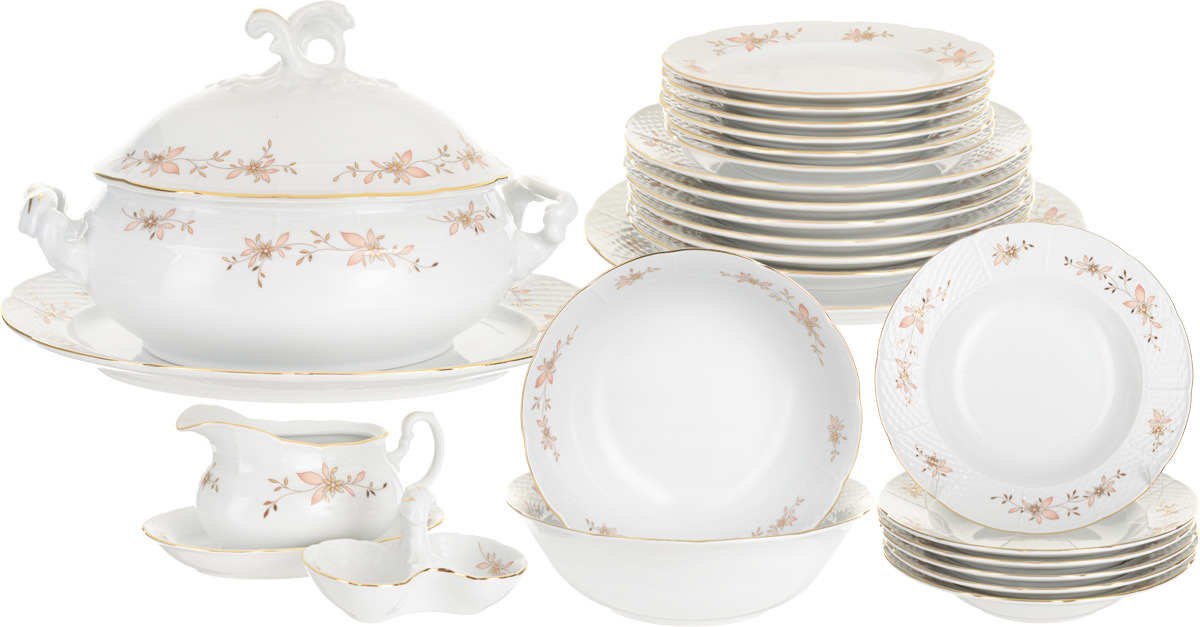 • Состав набора: супница, овальное блюдо, мелкое блюдо, салатник круглый, салатник круглый, тарелка десертная 19 см - 6 шт, тарелка глубокая 23 см - 6 шт, тарелка мелкая 25 см - 6 шт, соусник, подставка под соусник, прибор для специй