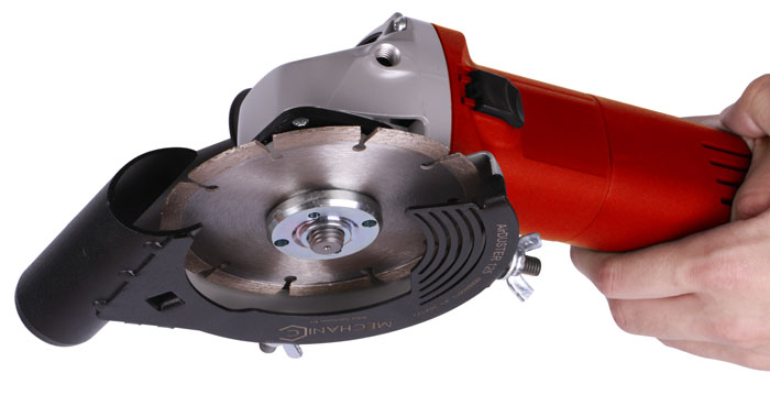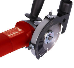 Представленный защитный кожух предназначен для болгарки с диаметром диска 230 мм. Установка очень легкая – необходимо всего лишь зафиксировать его двумя гайками на инструменте. Для защиты органов дыхания оператора предусмотрен пылеотвод под пылесос.