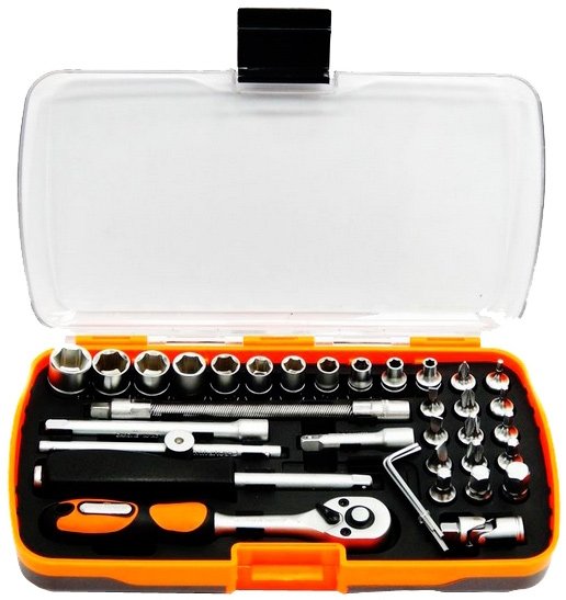 - Наличие в наборе Шестигранные ключи; Удлинители 1/4"; Трещотка 1/4"; Торцевые головки 1/4"; Отвертка под биты; Биты