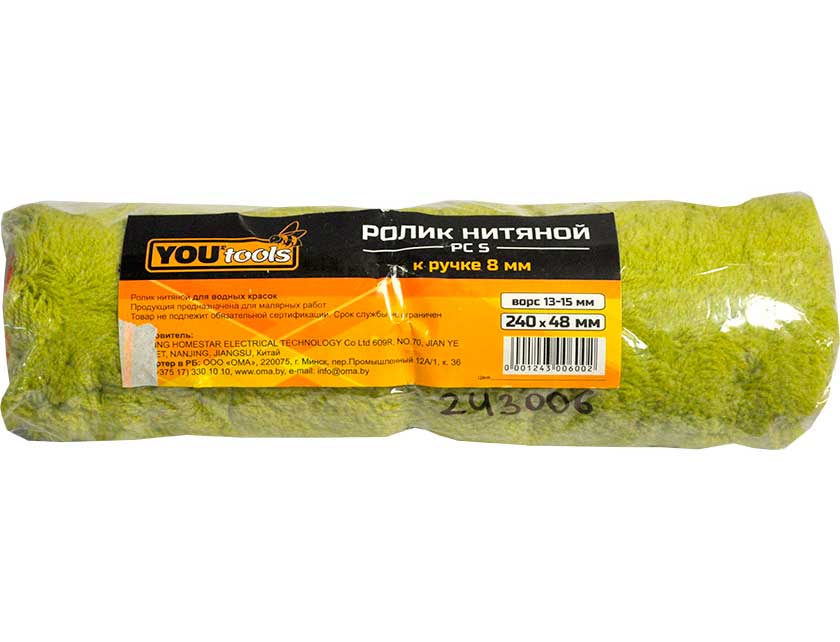 Ролик нитяной Yourtools PС S 240х48 мм, для водных красок, к ручке 8 мм, ворс 13-15 мм