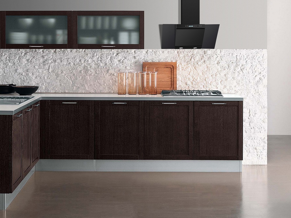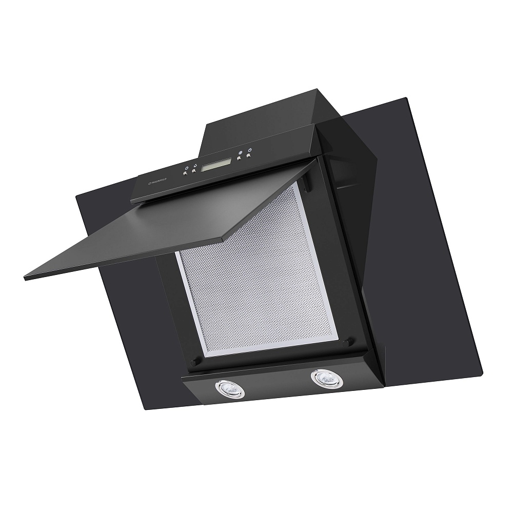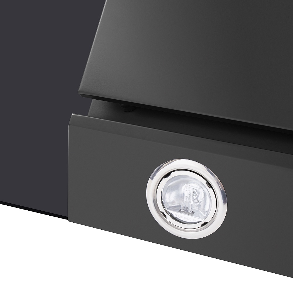 Наклонная вытяжка из стали с устойчивым черным, эмалевым покрытием и отделкой прочным, тонированным стеклом, алюминиевый жироулавливающий фильтр спрятан за стальной панелью. Эстетичный внешний вид вытяжки Gloria не теряется в течении всего срока службы.