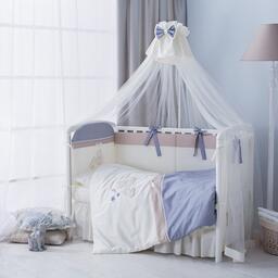 Пододеяльник оснащен вшитой молнией, чтобы одеяло не сбивалось, а простыня на резинке создает дополнительные удобства малышу (не сминается) и маме (легко снимать и надевать). Наполнен бампер гипоаллергенным составом натуральной ткани Hollcon, которая помогает сохранять форму.