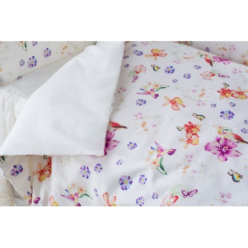 Комплект Акварель – настоящая находка для спальни маленькой леди. Изящество манеры исполнения настолько пронизано французскими мотивами, что, любуясь яркими узорами, представляешь себя под звездным небом Парижа. Малышка будет довольна, если на ее постель лягут цвета Франции. Неоспоримо прекрасные линии, милые рюши и шелковые банты обязательно произведут впечатление на маленькую хозяйку.