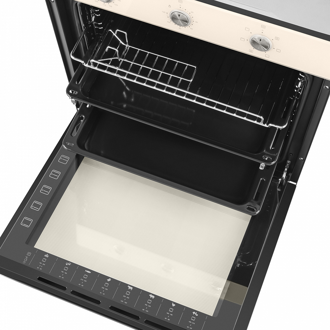Стекло с трамп-линией позволяет создавать визуальный эффект однородности стекла, при выключенном освещение внутреннее содержимое духовой камеры не видно, будь то сковородки, противни т.д, а при включенном освещение весь процесс приготовления виден без помех.