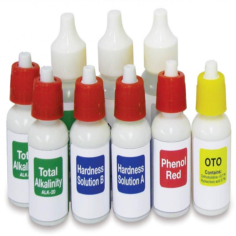 Набор включает 9 пузырьков по 15-30 мл с реагентами. Используется вместе с капельным тестером Kokido K335СВ 6 в 1 для определения уровня pH, хлора (Cl), брома (Br), общей щелочности (total alkalinity), жесткости воды (hardness) и стабилизатора (ceanuric Acid).