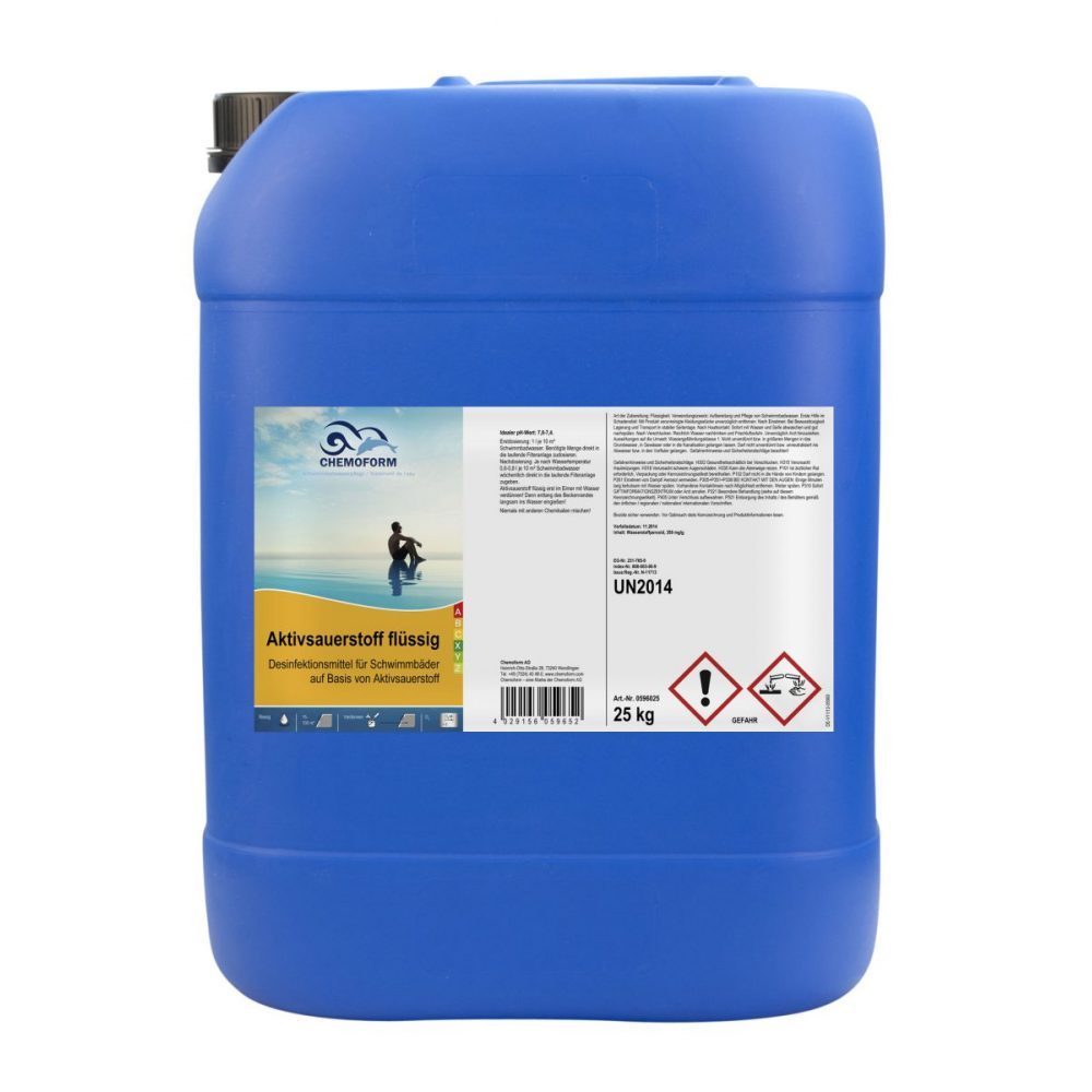 Активный кислород, жидкий 22 кг от производителя Chemoform изготовлен на основании активного кислорода. Основной целью вещества является проведение безхлорной дезинфекции для бассейнов. В состав продукции входит пероксид водорода.