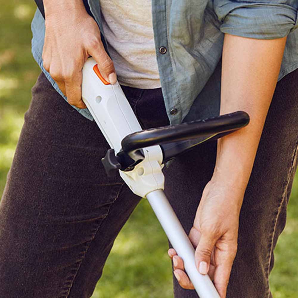 Мягкая противоскользящая ручка аккумуляторного триммера Stihl FSA 56 регулируется по высоте без использования отвертки в зависимости от индивидуальных особенностей. Кнопка включения выключения находится непосредственно на ручке, что облегчает работу. Небольшой вес 2,5 кг и компактный размер позволяют косить траву в углах и узких местах, а также хранить и перевозить в багажнике.