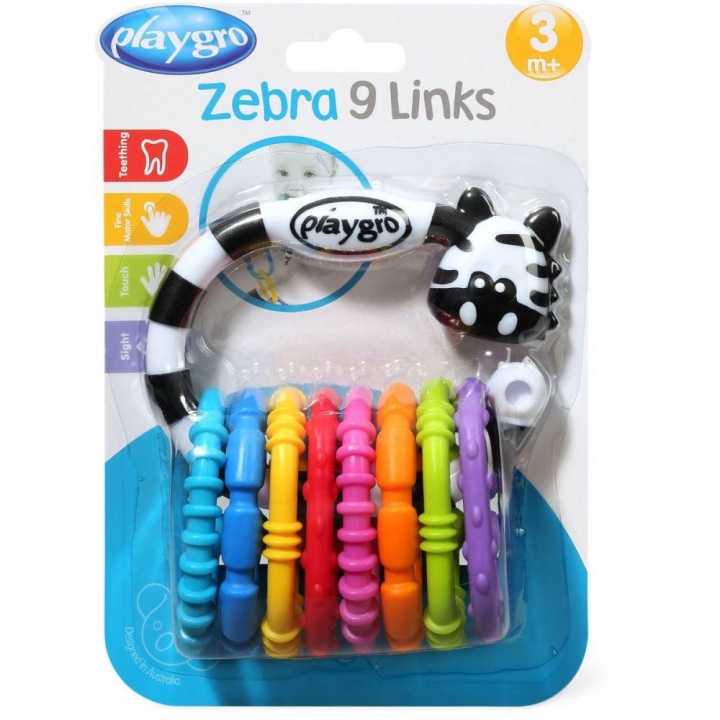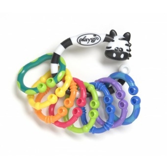 Прорезыватель Playgro "Зебра" - не просто интересная и яркая игрушка для маленьких деток, но и отличный прорезыватель. Она представляет собой кольцо на которое нанизаны 6 звеньев прорезывателей. Такой прорезыватель идеально подходит по форме для маленьких ротиков и ручек и смягчает боль при прорезывании зубов. Дизайн игрушки разработан таким образом, чтоб малышу было удобно держать прорезыватель, перекладывать из ручки в ручке.