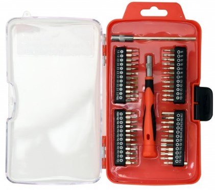 Набор бит 50 предметов. Slot: 1.5, 1.5, 2.0, 2.0, 2.5, 2.5, 3.0, 3.0, 3.5, 3.5, 3.5mm, Phillips: PH000, PH000, PH00, PH00, PH0, PH0 , PH0 , PH0 ,PH1 , PH1 , PH1 , PH1, POZI: PZ0, PZ0, PZ1, PZ1, PZ1, PZ1, TORX: T5, T6, T7, T8, T8, T9, T9, T10, T10,T15, T15,T20; T20, HEX: H0.9, H1.3, H2, H2.5, H3, H4, 1 x 120 мм удлинитель, 1 x рукоятка.