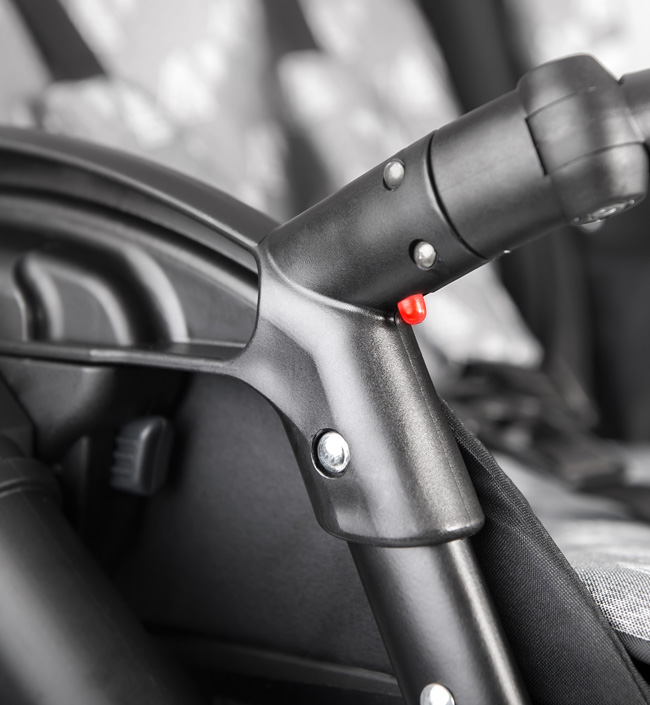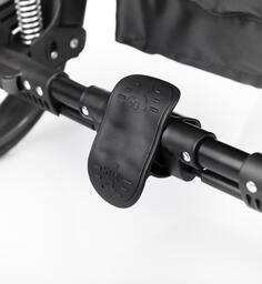 Легкая алюминиевая рама коляски выполнена в стильной темно-дымчатой расцветке, а регулируемая в 4 положениях ручка украшена эко-кожей с элегантной прострочкой.