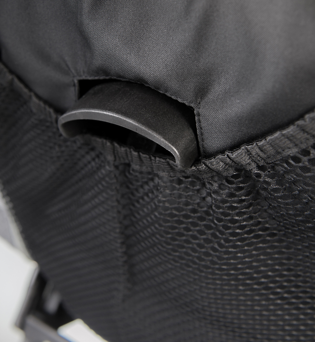 Бесшумно регулируемый в нескольких положениях капор XXL снабжен системой вентиляции, а также благодаря молниям может увеличиваться в размерах.