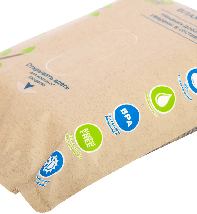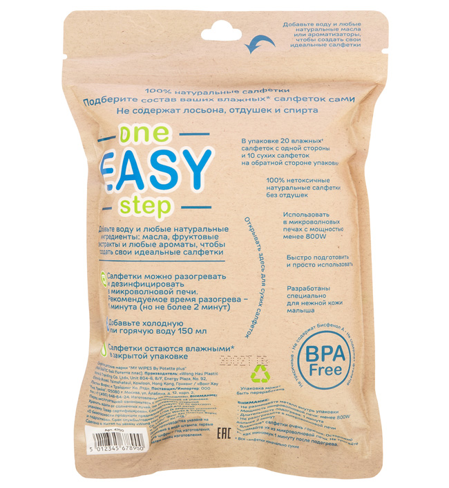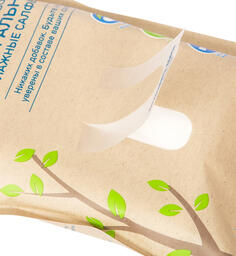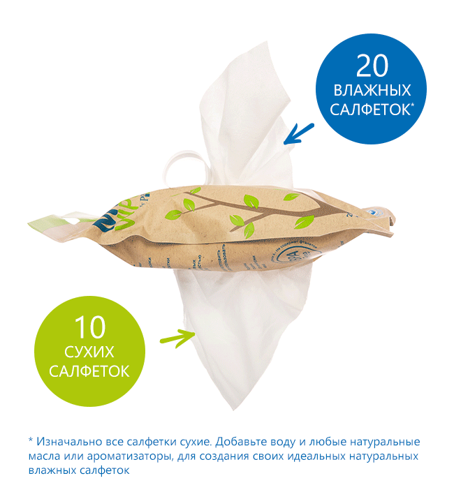 В упаковке 20 влажных* салфеток с одной стороны и 10 сухих салфеток на обратной стороне.